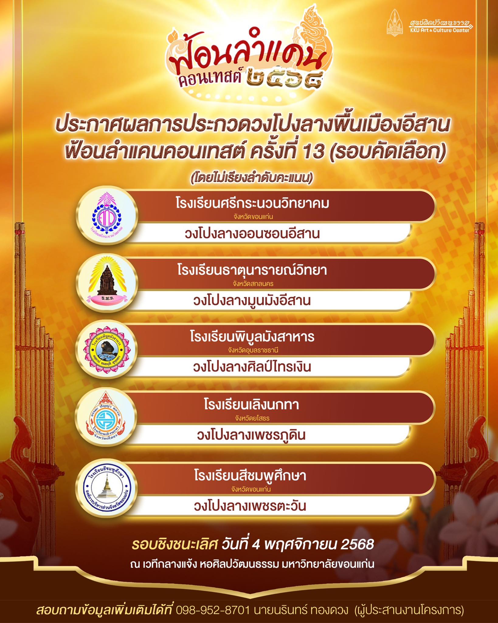 ประกาศผลการประกวดวงโปงลางพื้นเมืองอีสาน "ฟ้อนลำแคนคอนเ […]