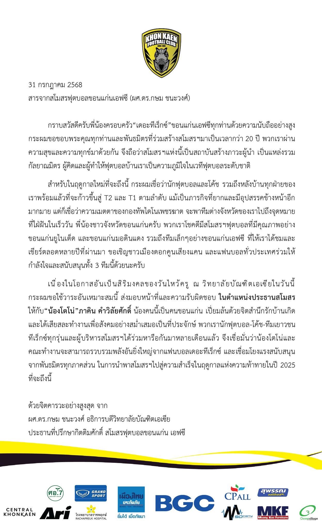 โดยผศ.ดร.กษม ระบุว่า “โตโน่” พร้อมที่จะนำพาสโมสรขอนแก่น เอฟซี ไปสู่ความสำเร็จในลีกสูงสุดภายในปี 2025 ตามเป้าหมายที่ได้วางไว้