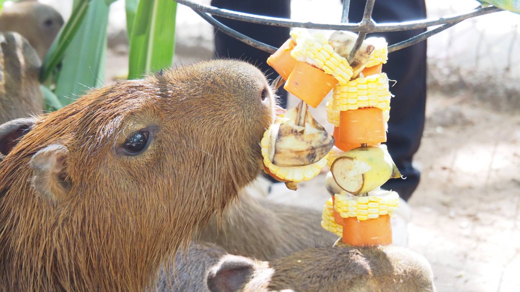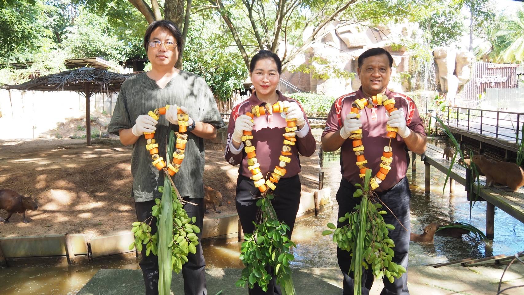 “สำหรับพวงมาลัยอาหารสัตว์ที่จัดทำขึ้นในครั้งนี้ ผลิตจากอาหารธรรมชาติที่คาปิบาร่าชื่นชอบ ได้แก่ แครอท กล้วย ข้าวโพด และหญ้าเนเปียร์ นำมาจัดเรียงอย่างประณีตในรูปแบบพวงมาลัย เพื่อกระตุ้นพฤติกรรมตามธรรมชาติของสัตว์ เช่น การดมกลิ่น การแทะ และการค้นหาอาหาร ซึ่งเป็นแนวทางหนึ่งในการลดความเครียดและความเบื่อหน่ายของสัตว์ในที่เลี้ยง สอดคล้องกับหลักสวัสดิภาพสัตว์ 5 ประการ โดยเฉพาะด้าน “การส่งเสริมพฤติกรรมตามธรรมชาติ” (Behavioral Enrichment) ซึ่งถือเป็นหัวใจสำคัญของการบริหารจัดการดูแลสัตว์ในสวนสัตว์ยุคใหม่”