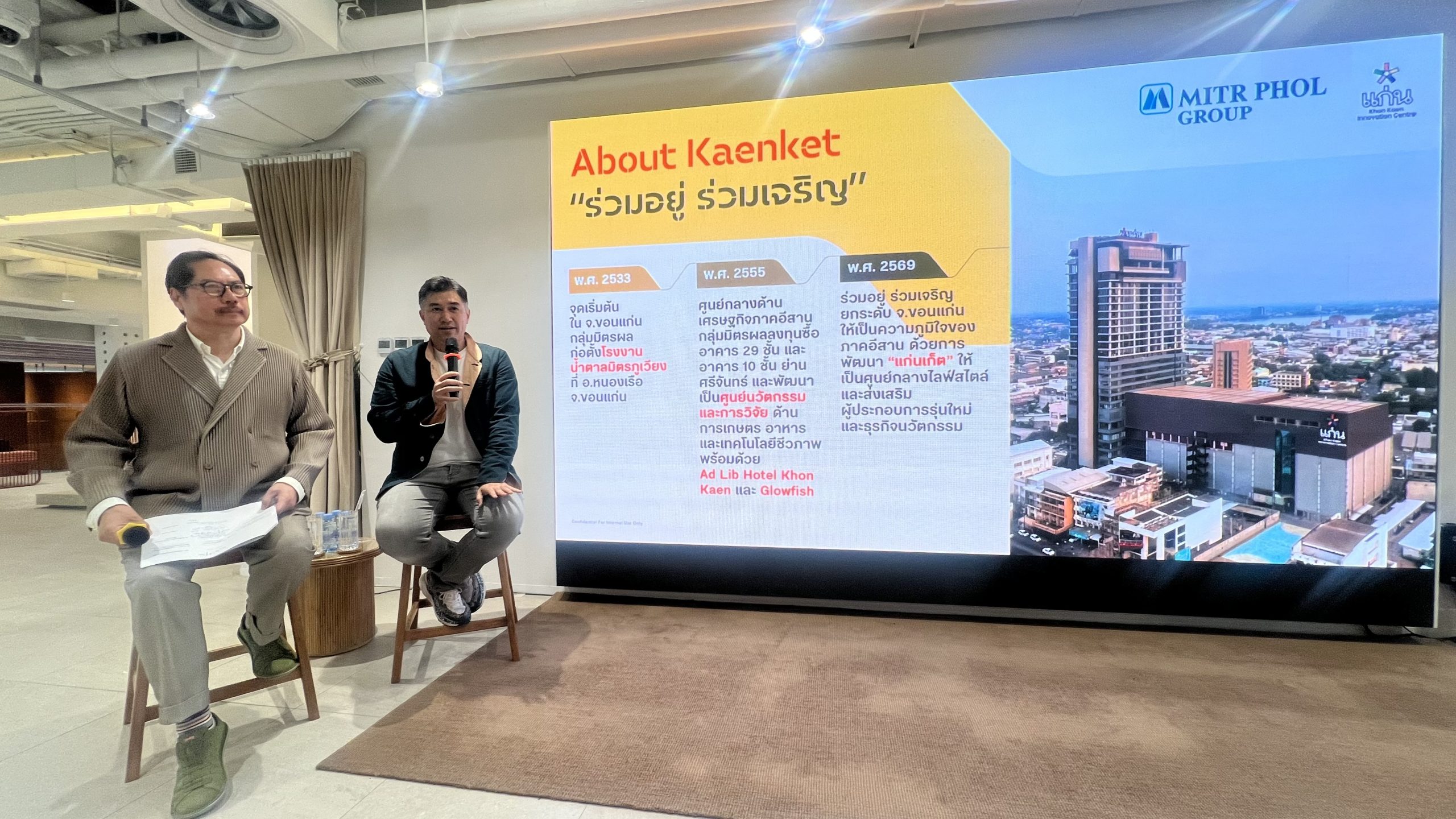 นายกวิน ว่องศุภกิจ กรรมการ บริษัท เฮอริเทจ เอสเตทส์ จำกัด ในเครือมิตรผล กรุ๊ป เปิดเผยว่า ปัจจุบันกลุ่มมิตรผล ไม่ได้เป็นผู้เล่นหน้าใหม่ที่ขอนแก่นและภาคอีสาน บริษัทฯได้เปิดโรงงานน้ำตาลมิตรภูเวียง ที่ อ.หนองเรือ มาตั้งแต่ปี 2533 และปัจจุบันมีโรงงานน้ำตาล 5 แห่งในภาคอีสาน และในปี 2555 ได้มีโอกาสลงทุนบนทีดินพร้อมอาคาร 29 ชั้นและศูนย์การค้าตึกคอม 10 ชั้น บนทีดินแปลงใหญ่รวมกว่า 9 ไร่ กลางใจเมืองและได้มีการพัฒนาและเปิดตัวใหม่ในชื่อ ขอนแก่น อินโนเวชั่นเซ็นเตอร์ เพื่อเป็นพื้นที่ของศูนย์นวัตกรรมและการวิจัยของมิตรผล และมีโรงแรมแอดลิป ขอนแก่น พร้อมแก่นแก้วไลฟ์เฮาส์ รวมทั้งจุดชมวิวสูงที่สุดกลางเมืองขอนแก่น และพื้นทีโคเวิร์กกิ้งเสปซ ในนามของโกลด์ฟิชด์ วันนี้บริษัทฯได้หารือร่วมทุกฝ่ายเพื่อร่วมกันพัฒนาตึกแห่งความร่วมมือ เพื่อขับเคลื่อนพลังของคนอีสานรุ่นใหม่ โดยการวางโครงการแก่นเก็ตให้เป็นศูนย์กลางของคุณภาพชีวิตอันดับหนึ่งที่คัดสรรเพื่อเติมเต็มไลฟ์และเป็นพื้นที่ส่งเสริมผู้ประกอบการที่มีศักยภาพในขอนแก่นและภาคอีสานบนทำเลศักยภาพสูงย่านศรีจันทร์ใจกลางเมืองขอนแก่น