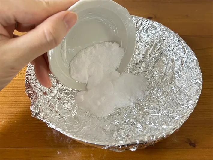 นอกจากนี้ ผู้เขียนได้ทดลองอีกวิธีที่สะดวกขึ้น โดยใช้ “ถ้วยอลูมิเนียมฟอยล์” เบอร์ 9 จากร้านไดโซะ วางถ้วยบนจานทนความร้อน ใส่เครื่องประดับและเบกกิ้งโซดา 1 ช้อนชา เติมน้ำร้อนแล้วรอเพียง 15 นาที ก่อนล้างและเช็ดให้แห้ง ผลลัพธ์คือเครื่องเงินเงาวับไม่ต่างจากวิธีแรก เหมาะอย่างยิ่งสำหรับของชิ้นเล็ก เช่น ต่างหู แหวน หรือจี้ห้อยคอ