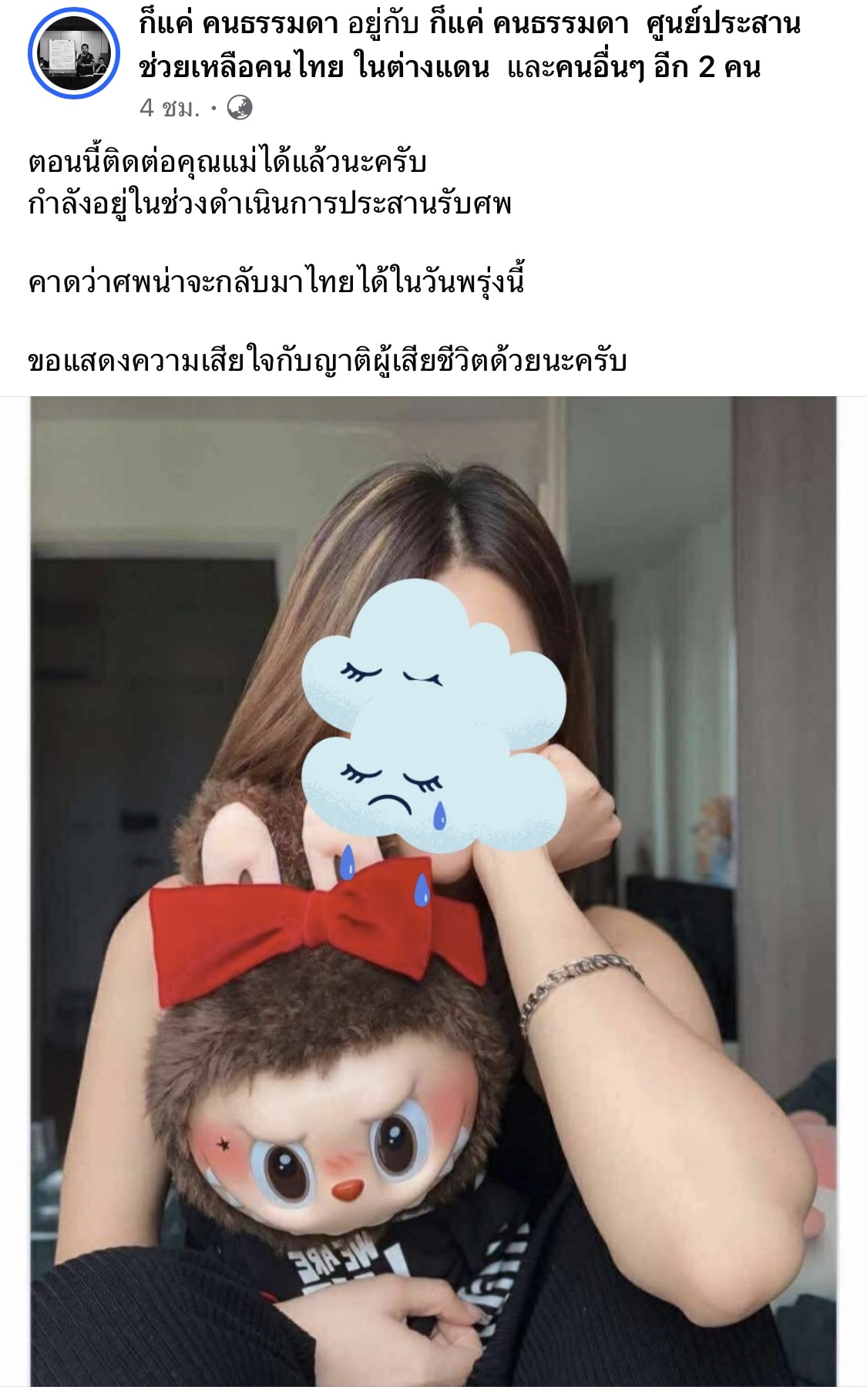 นางพัชรียังระบุว่า ขณะอยู่กับญาติแถวขอนแก่น ผู้เสียชีวิตมีนิสัยเก็บกด ชอบทำร้ายตัวเอง เช่น กรีดแขน จนกระทั่งย้ายออกจากบ้านวัยประมาณ 10 ขวบ และจากนั้นติดต่อไม่ได้มาโดยตลอด เมื่อทราบข่าวก็รู้สึกตกใจอย่างยิ่ง ขณะที่ในโลกโซเชียลผู้ใช้เฟซบุ๊กชื่อ “ก็แค่ คนธรรมดา” ได้โพสต์ภาพหญิงไทยเสียชีวิตอยู่หน้าตึกสูงในปอยเปต พร้อมข้อความร้องขอข้อมูลเพิ่มเติม ระบุว่าตึกดังกล่าวเป็นของการ “เทรดหุ้น” และสงสัยว่าน่าจะไม่ได้เกิดจากการโดดลงเอง โดยระบุว่า “ฃ คนไทยก็ไม่ตายฟรี ผมจะพาน้องกลับบ้าน” โดยต่อมาผู้โพสต์ได้อัพเดตว่าได้ติดต่อแม่ผู้เสียชีวิตได้แล้ว และอยู่ระหว่างดำเนินการประสานนำศพกลับไทยในวันรุ่งขึ้น