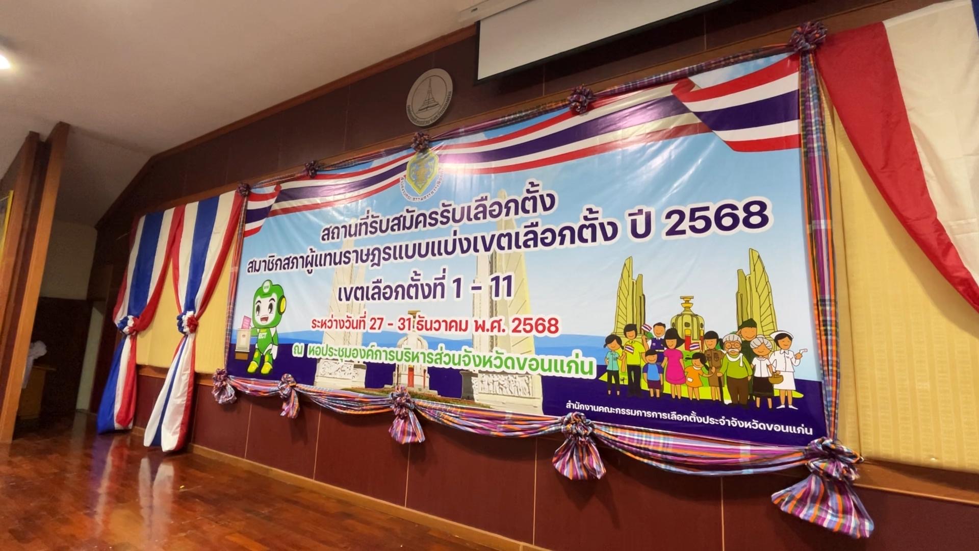เมื่อเวลา 14.00 น. วันที่ 26 ธ.ค. 2568 ที่ห้องประชุม อบจ.ขอนแก่น สถานที่ที่ กกต.ขอนแก่น ได้กำหนดเป็นสถานที่รับสมัครรับการเลือกตั้ง สส. แบบเขต ซึ่งจะทำการรับสมัครพร้อมกันทั้งประเทศในระหว่างวันที่ 27-31 ธ.ค. 2568 นายวัชระ สีสาร ผอ.กกต.ขอนแก่น ลงพื้นที่ตรวจความพร้อมของเจ้าหน้าที่และสถานที่ พร้อมมอบนโยบายการปฏิบัติหน้าที่แก่เจ้าหน้าที่ประจำเขตเลือกตั้งทั้ง 11 เขต เพื่อให้การดำเนินงานเป็นไปอย่างพร้อมเพรียง และไม่ให้เกิดข้อบกพร่องในทุกขั้นตอน