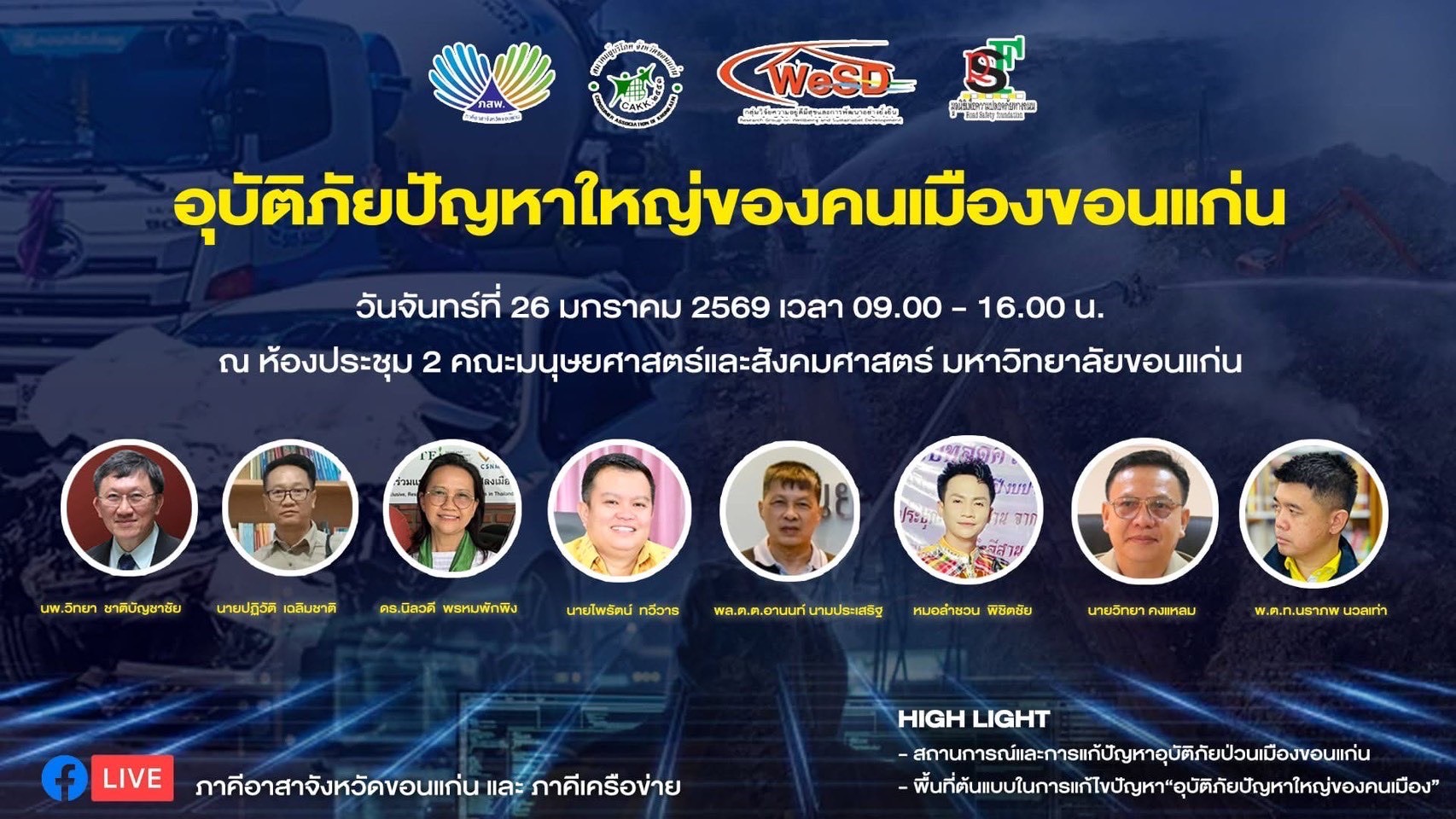 ขอนแก่น (26 มกราคม 2569) – ภาคีเครือข่ายจังหวัดขอนแก่นผนึกกำลังครั้งใหญ่ เปิดเวทีระดมสมองแสวงหาทางออก “อุบัติภัยปัญหาใหญ่ของคนเมือง” ณ มหาวิทยาลัยขอนแก่น เสนอแผนปฏิบัติการเชิงรุก โดยมุ่งยกระดับเป็นวาระจังหวัดภายใต้สโลแกน “ขอนแก่นอยู่ดีมีแฮง ฮักแพงแบ่งปัน ป้องกันอุบัติภัยใกล้ตัว”