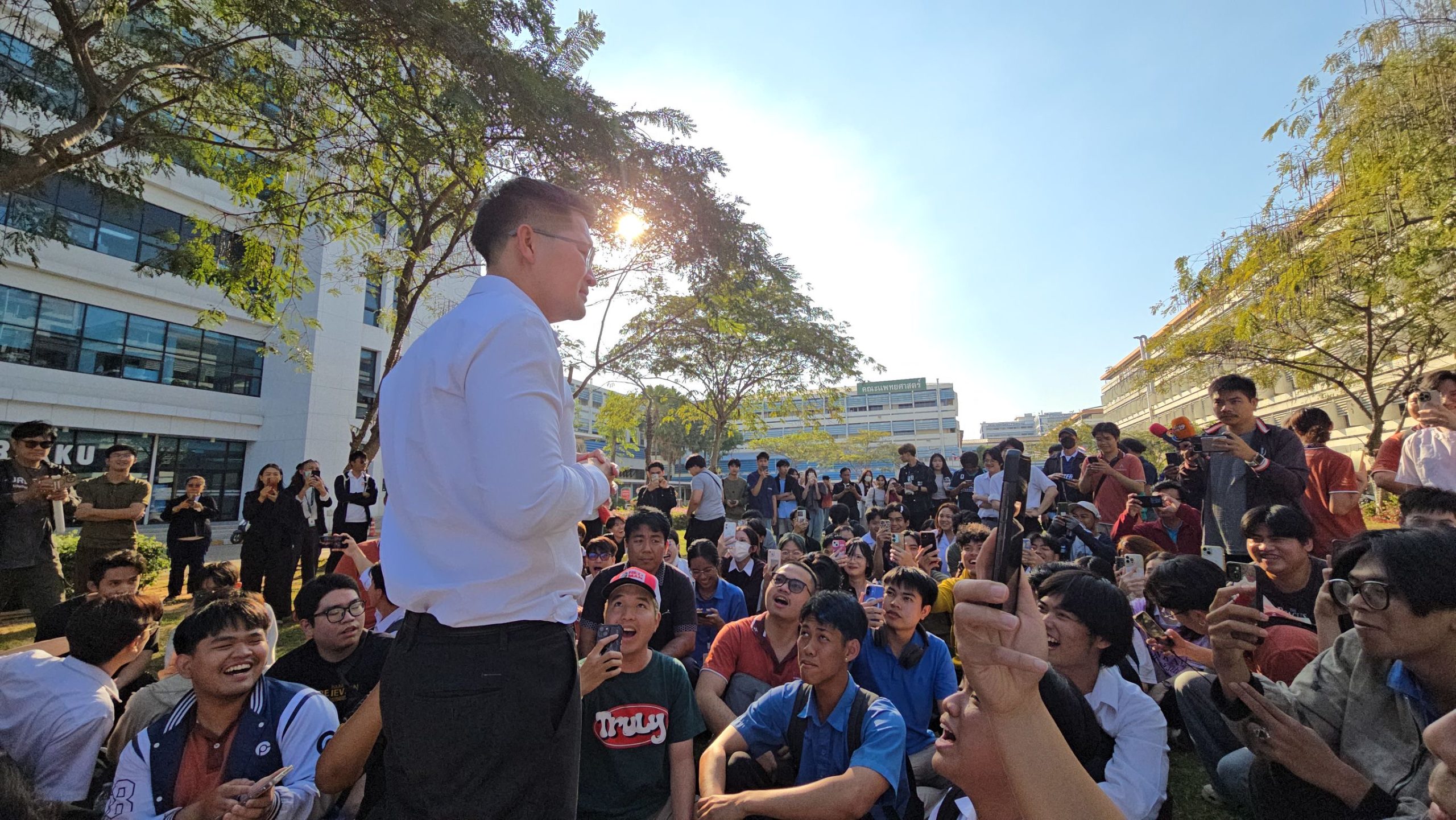 โดยบรรยากาศตลอดช่วงที่เต้อยู่ในพื้นที่นั้น นักศึกษาต่างยิงคำถามถึงนโยบายที่ใช้หาเสียง ทั้งเรื่องไปดาวอังคาร เรื่องการเพาะพันธุ์ไดโนเสาร์ กฎหมายผู้หญิงมีสามี 4 คน หรือนโยบายอื่นๆ ที่มีกระแสอยู่ในขณะนี้ รวมถึงความเคลื่อนไหวของทาง กกต. ที่ระบุว่านโยบายของทางพรรคทางเลือกใหม่เป็นนโยบายเพ้อฝัน ไม่สามารถทำได้และผิดกฎหมายอยู่ระหว่างดำเนินการตรวจสอบ ซึ่งนายเต้ มงคลกิตติ์สามารถตอบได้ทุกคำถาม เรียกเสียงโห่ชื่นชอบ และปรบมือเป็นระยะ ทั้งยังได้เข้าไปสวมกอดอวยพรขอให้โชคดีก่อนจะเดินทางไปเรียนตามตารางเรียน และมีการซื้อน้ำให้ดื่ม ก่อนที่จะร่วมถ่ายภาพกับกลุ่มนักศึกษา และทำการวิดพื้นตามความต้องการของนักศึกษา