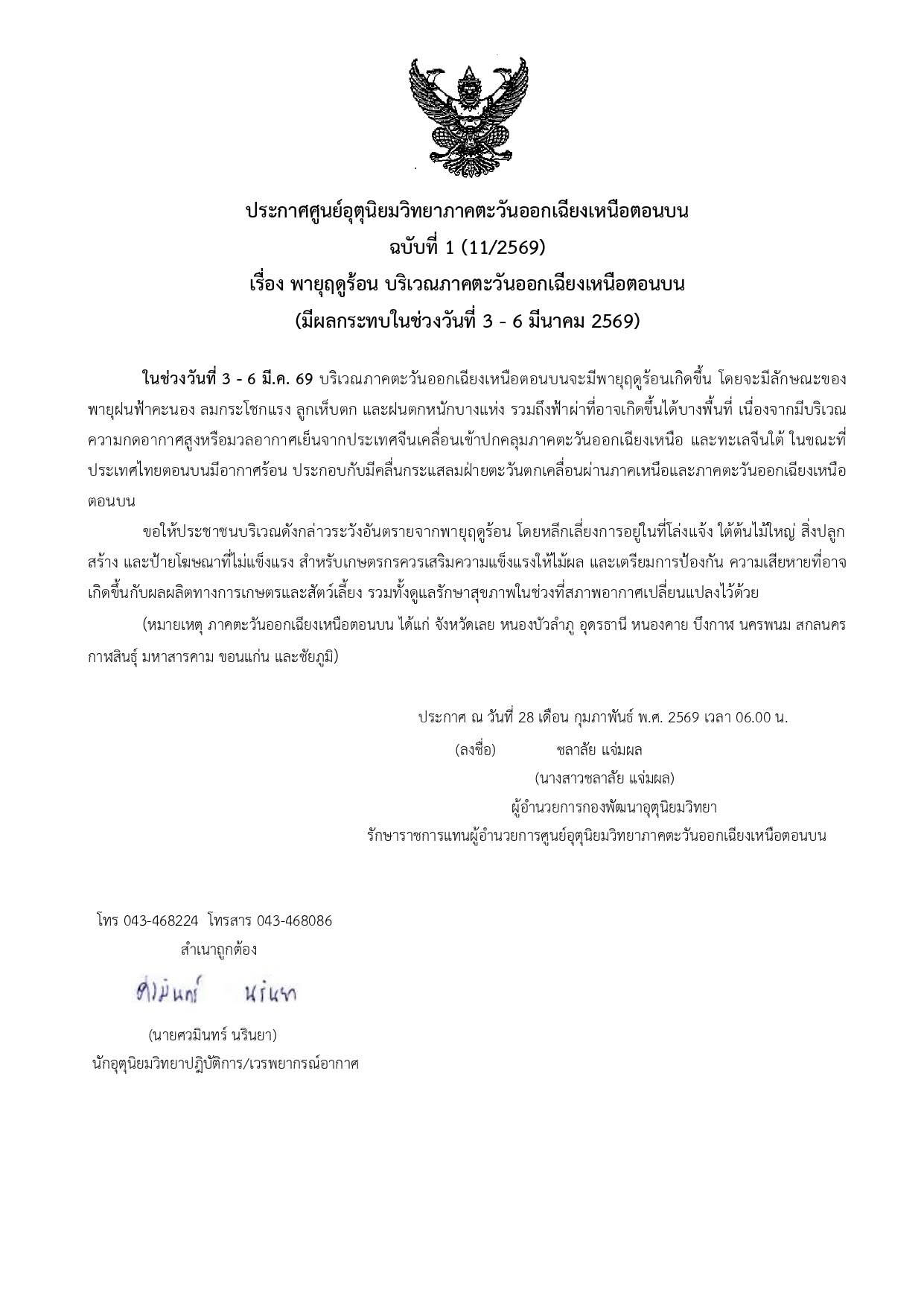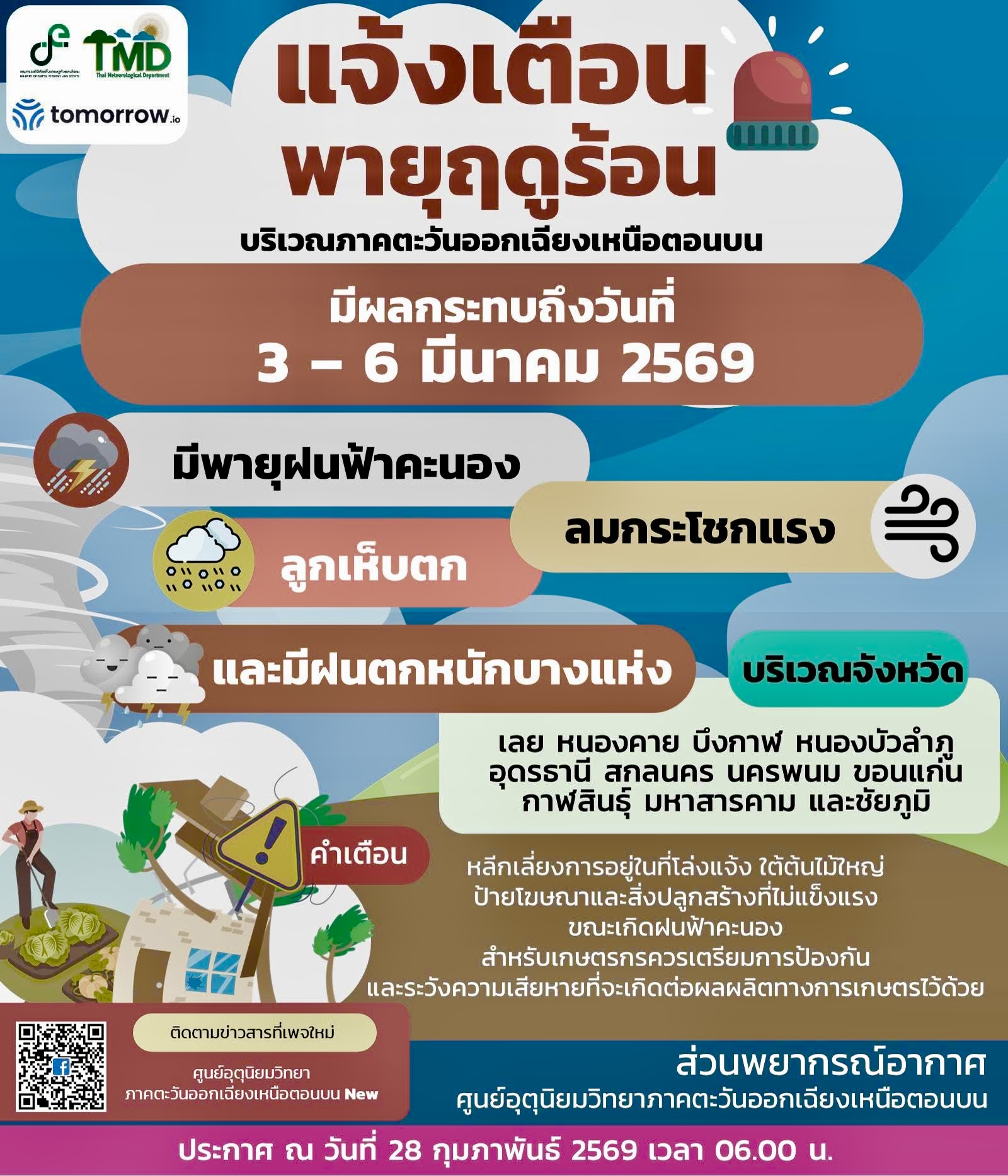 ศูนย์อุตุนิยมวิทยาภาคตะวันออกเฉียงเหนือตอนบน ออกประกาศฉบับที่ 1 (11/2569) เตือนพายุฤดูร้อนบริเวณภาคตะวันออกเฉียงเหนือตอนบน โดยจะมีผลกระทบในช่วงวันที่ 3-6 มีนาคม 2569