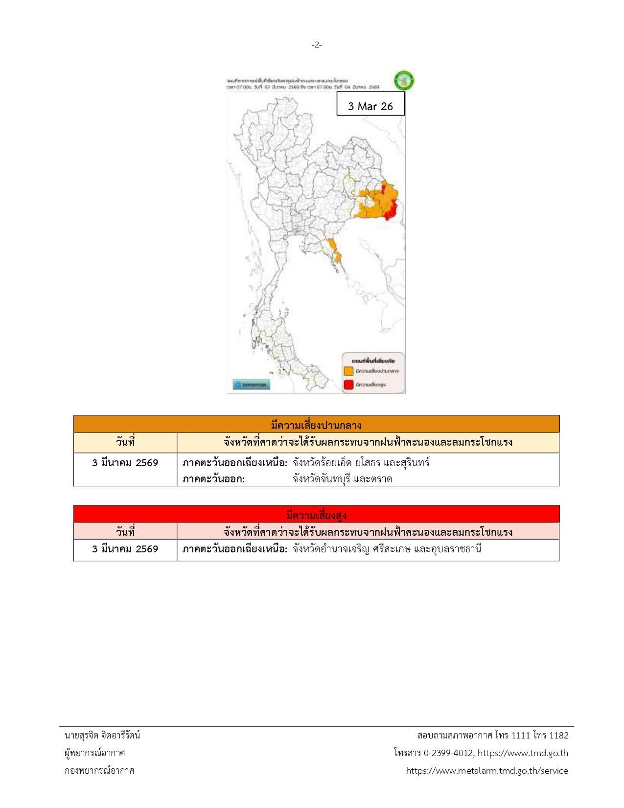 ประกาศ ณ 🗓️วันที่ 2 มีนาคม พ.ศ. 2569 เวลา 11.00 น. และกรมอุตุนิยมวิทยาจะออกประกาศฉบับต่อไปใน 🗓️วันที่ 3 มีนาคม พ.ศ. 2569 เวลา 11.00 น.