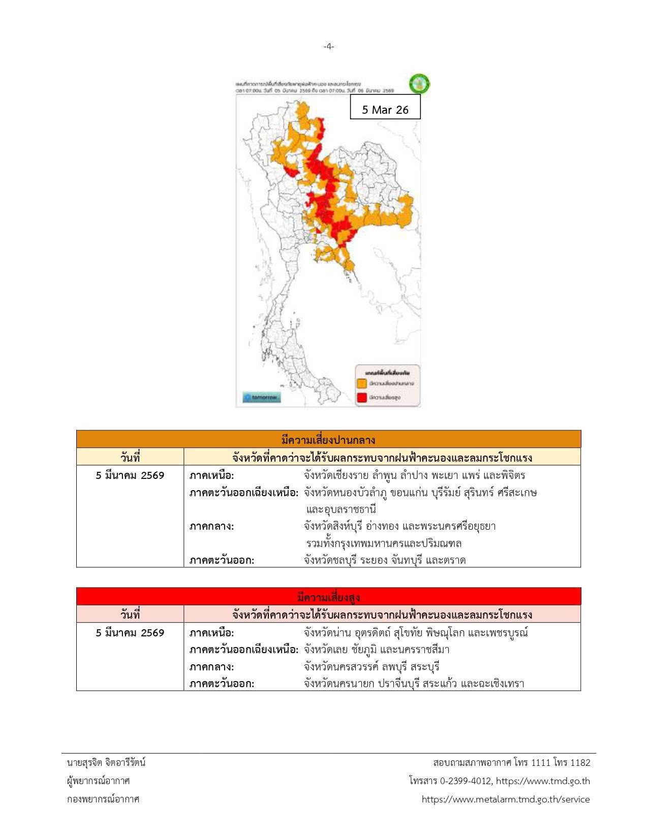 กรมอุตุนิยมวิทยาออกประกาศเตือน เรื่อง พายุฤดูร้อนบริเวณประเทศไทยตอนบน (มีผลกระทบในช่วงวันที่ 3 – 6 มีนาคม 2569) ฉบับที่ 3 (10/2569) โดยระบุว่า ในช่วงวันที่ 3 – 6 มี.ค. 69 บริเวณประเทศไทยตอนบนจะมีพายุฤดูร้อนเกิดขึ้น เริ่มจากด้านตะวันออกของภาคตะวันออกเฉียงเหนือก่อน จากนั้นภาคตะวันออก ภาคกลาง รวมทั้งกรุงเทพมหานครและปริมณฑล และภาคเหนือ จะได้รับผลกระทบในระยะต่อไป