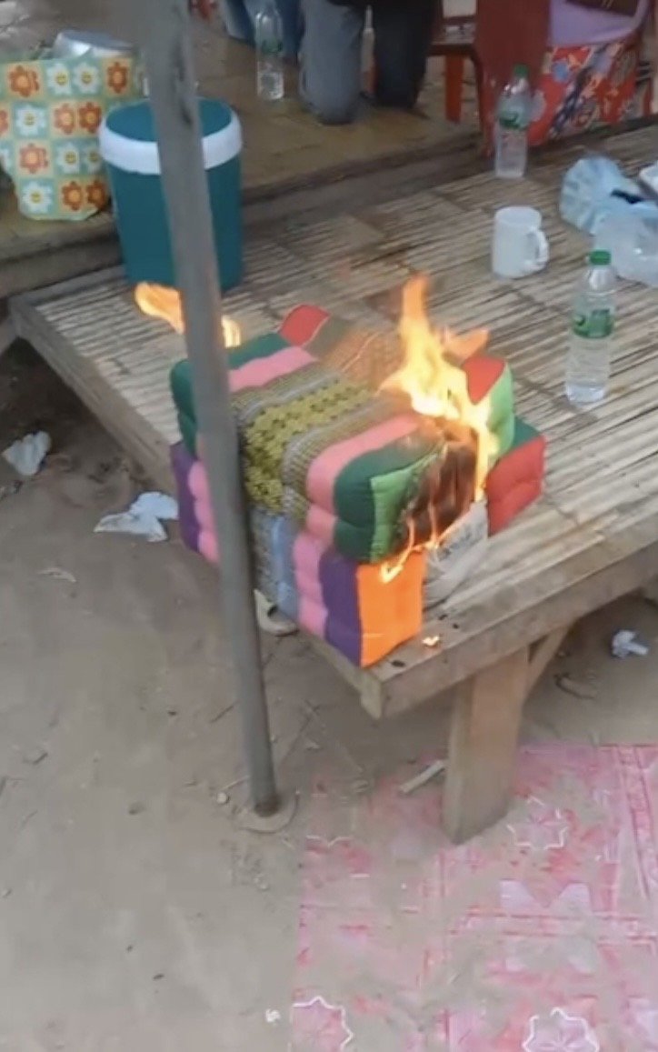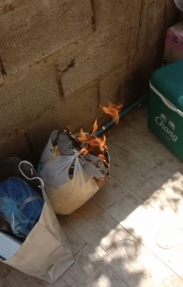 ก่อนเริ่มพิธี ได้เกิดไฟไหม้กองเสื้อผ้าเด็กที่อยู่ข้างบ้าน และหลังจากพระทำพิธีเสร็จไม่ถึง 15 นาที ก็เกิดเหตุไฟลุกไหม้ขึ้นอีก 2 ครั้ง โดยครั้งแรกไฟลุกไหม้หมอนขิดที่วางเรียงกันจำนวน 4 ใบ ต่อหน้าชาวบ้านที่อยู่กันนับสิบคน จากนั้นประมาณ 5 นาที ก็เกิดไฟลุกไหม้ที่ขากางเกงของลูกสาวคนกลาง อายุ 24 ปี จนชาวบ้านต้องช่วยกันดับไฟ สร้างความตกใจและงุนงงกับเหตุการณ์ที่เกิดขึ้น