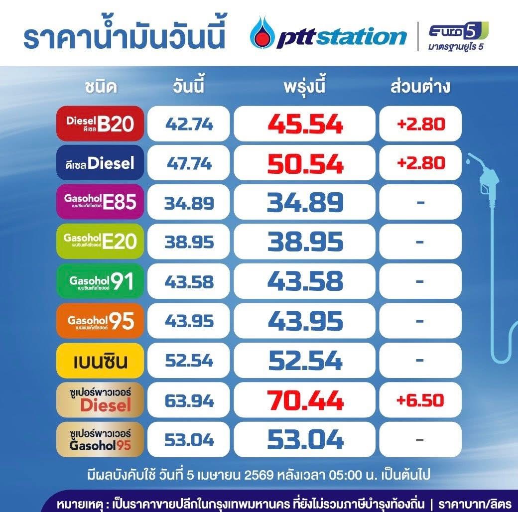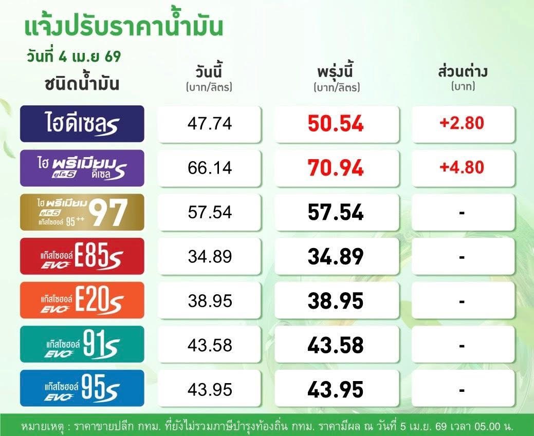 เมื่อเวลา 22.00 น. วันที่ 4 เม.ย. 2569 ภายหลังคณะกรรมการบริหารกองทุนน้ำมันเชื้อเพลิง (กบน.) มีมติปรับขึ้นราคาน้ำมันดีเซล 2.80 บาทต่อลิตร และมีผลในวันที่ 5 เม.ย. 2569 ส่งผลให้ราคาน้ำมันดีเซลอยู่ที่ลิตรละ 50.54 บาท ขณะที่น้ำมันดีเซลพรีเมี่ยมปรับขึ้น 4.80 บาทต่อลิตร ทำให้ราคาขยับไปอยู่ที่ลิตรละ 70.94 บาท