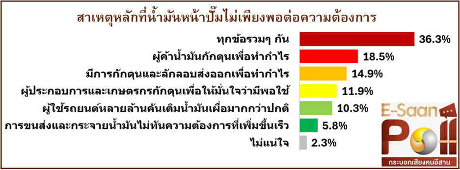 ผลสำรวจระบุว่า สาเหตุหลักที่น้ำมันหน้าปั๊มไม่เพียงพอ อันดับ 1 ร้อยละ 36.3 มองว่าเกิดจากทุกปัจจัยรวมกัน รองลงมาร้อยละ 18.5 เชื่อว่าผู้ค้าน้ำมันกักตุนเพื่อทำกำไร ร้อยละ 14.9 เกิดจากการกักตุนและลักลอบส่งออก ร้อยละ 11.9 ผู้ประกอบการและเกษตรกรกักตุนเพื่อให้มั่นใจว่ามีพอใช้ ร้อยละ 10.3 ผู้ใช้รถยนต์เติมน้ำมันเผื่อมากกว่าปกติ และร้อยละ 5.8 การขนส่งและกระจายน้ำมันไม่ทันความต้องการ