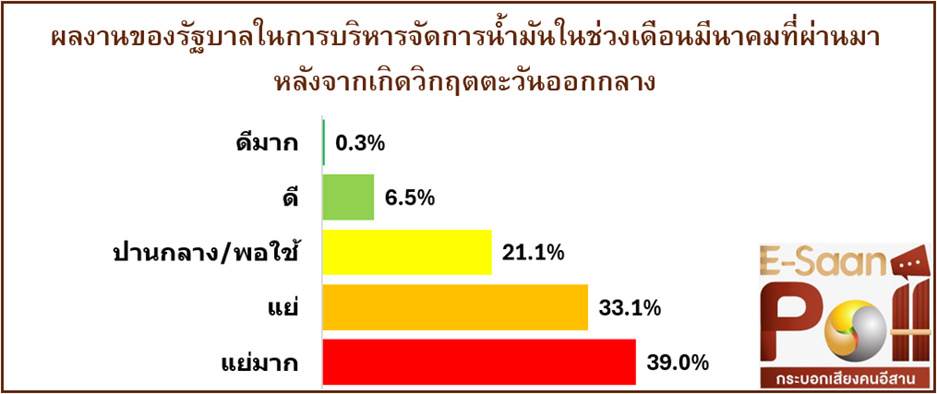 ส่วนการประเมินผลงานรัฐบาลในการบริหารจัดการน้ำมันหลังวิกฤตตะวันออกกลาง พบว่า ร้อยละ 39.0 ให้คะแนนแย่มาก ร้อยละ 33.1 แย่ ร้อยละ 21.1 ปานกลาง ร้อยละ 6.5 ดี และร้อยละ 0.3 ดีมาก