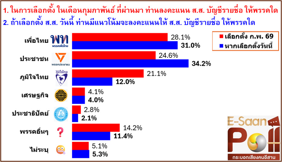 ขณะเดียวกัน แนวโน้มคะแนนนิยมทางการเมืองเปลี่ยนแปลง โดยพรรคเพื่อไทยเพิ่มจากร้อยละ 28.1 เป็น 31.0 พรรคประชาชนเพิ่มจากร้อยละ 24.6 เป็น 34.2 ขณะที่พรรคภูมิใจไทยลดลงจากร้อยละ 21.1 เหลือ 12.0 และพรรคอื่นๆ มีการเปลี่ยนแปลงลดลงเช่นกัน