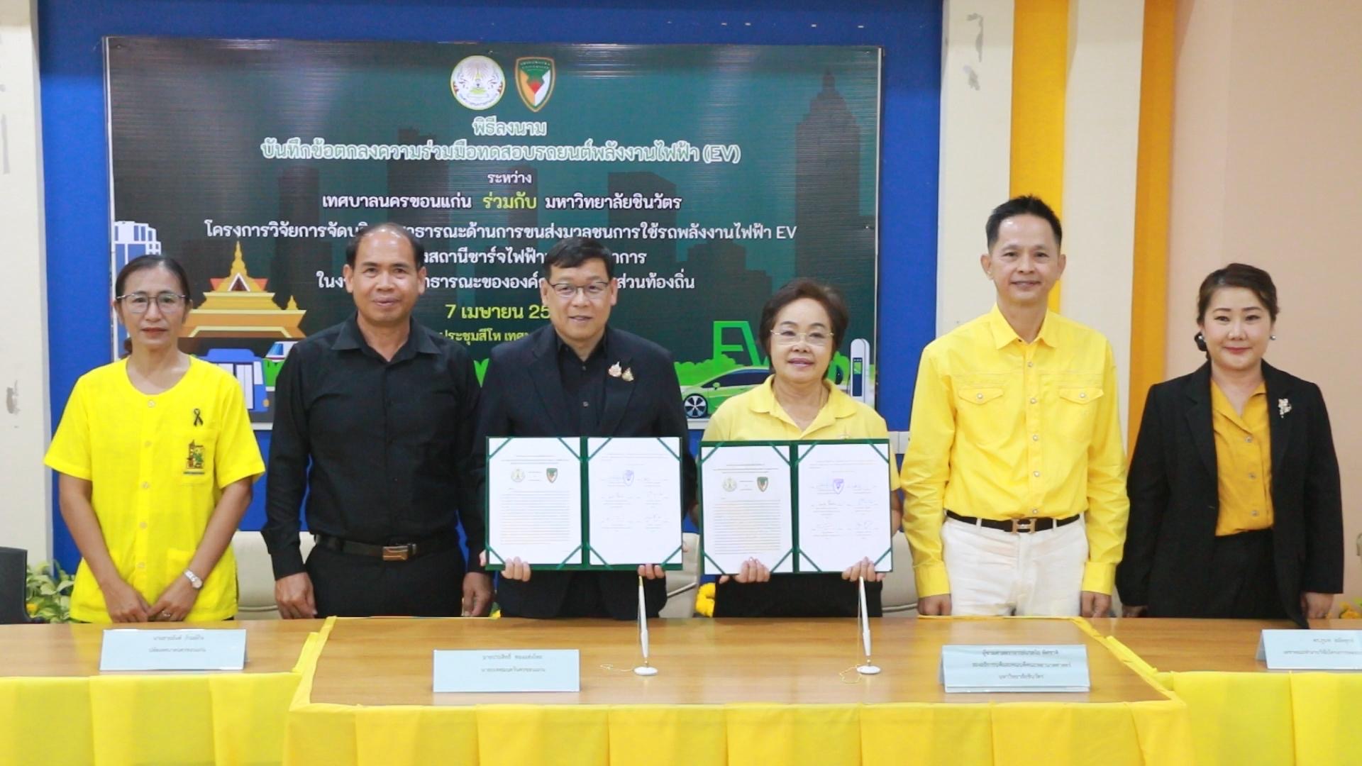 เมื่อเวลา 11.00 น. วันที่ 7 เม.ย. 2569 ที่ห้องประชุมสีโห เขตเทศบาลนครขอนแก่น นายประสิทธิ์ ทองแท่งไทย นายกเทศมนตรีนครขอนแก่น พร้อมด้วย ผศ.นวลใย พิศชาติ รองอธิการบดีมหาวิทยาลัยชินวัตร ร่วมลงนามในบันทึกข้อตกลงความร่วมมือทดสอบรถยนต์พลังงานไฟฟ้า (EV) ตามโครงการวิจัยการจัดบริการสาธารณะด้านการขนส่งมวลชน การใช้รถพลังงานไฟฟ้า EV และติดตั้งสถานีชาร์จไฟฟ้าแบบบูรณาการในงานบริการสาธารณะขององค์กรปกครองส่วนท้องถิ่น โดยมีผู้นำองค์กรปกครองส่วนท้องถิ่นในพื้นที่ รวมทั้งนักวิชาการ ผู้แทนหน่วยงานภาครัฐ และเอกชน ร่วมเป็นสักขีพยานอย่างพร้อมเพรียง