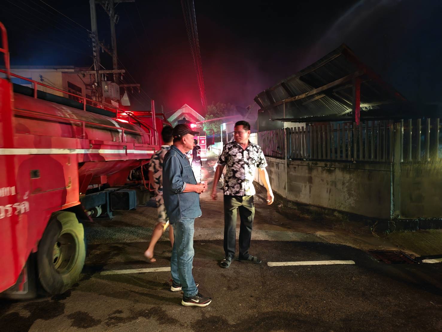 นายสุทิน อายะ อายุ 56 ปี เพื่อนบ้านซึ่งพักอาศัยอยู่ฝั่งตรงข้าม เล่าว่า ขณะเกิดเหตุตนนอนดูโทรทัศน์อยู่ภายในบ้าน ก่อนสังเกตเห็นแสงสว่างผิดปกติจึงออกไปดู พบไฟกำลังลุกไหม้บ้านของนายประสงฆ์ จึงตะโกนแจ้งว่าไฟไหม้ ทำให้คนในบ้านรีบวิ่งหนีออกมา รวมถึงเจ้าของบ้าน และมีเด็กชายวัย 13 ปี วิ่งออกมาพร้อมบอกให้ช่วยคนที่อยู่ชั้นสอง อย่างไรก็ตาม ตนยืนยันว่าทุกคนสามารถหนีออกมาได้ทัน