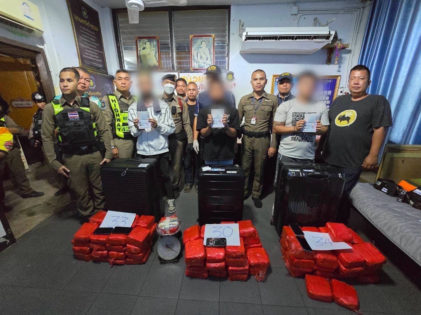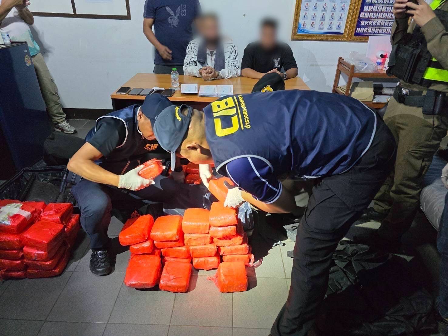 จากนั้นเจ้าหน้าที่ได้บูรณาการการทำงานร่วมกันทุกฝ่าย จนสืบทราบว่าผู้ต้องหาทั้ง 3 ราย เป็นชาวมาเลเซีย และเดินทางเข้าไทยผ่านด่านตรวจคนเข้าเมือง อ.สะเดา จ.สงขลา เจ้าหน้าที่จึงควบคุมตัวไว้ พร้อมแสดงหลักฐานเป็นภาพจากกล้องวงจรปิด ก่อนที่ทั้ง 3 คนจะให้การรับสารภาพว่าเป็นผู้นำกระเป๋าขึ้นขบวนรถไฟจริง แต่ให้การอ้างว่ามีผู้นำมาฝากให้ขนเข้ากรุงเทพฯ และไม่ทราบรหัสเปิดกระเป๋า