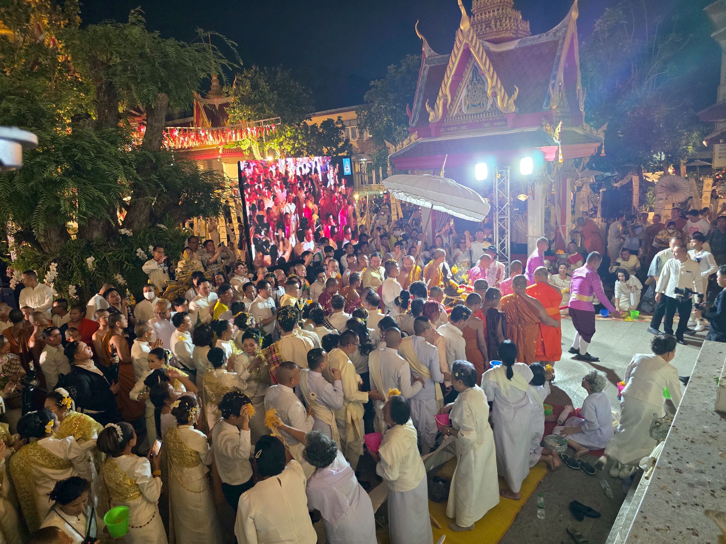 ต่อมาเมื่อขบวนเคลื่อนเข้าสู่เขตวัดธาตุ พระอารามหลวง ในเวลา 20.00 น. ชาวขอนแก่นได้ร่วมกันเคลื่อนขบวนเวียนประทักษิณรอบพระอุโบสถ 3 รอบ โดยมีพระสงฆ์ 9 รูป เจริญบทจุลชัยปกรณ์และเจริญชัยมงคลคาถา เจ้าพนักงานประโคมกลองแลง ลั่นฆ้อง และเป่าแตรสังข์ ท่ามกลางพุทธศาสนิกชนที่นั่งรอบอุโบสถร่วมโปรยดอกไม้รับขบวนราชรถพระศรีสัตนาคนหุต เมื่อครบสามรอบ ขบวนแห่จอดพักด้านทิศตะวันออกของพระอุโบสถ ก่อนที่นายขจรเกียรติ รักพานิชมณี ผู้ว่าราชการจังหวัดขอนแก่น และ รศ.นพ.ชาญชัย พานทองวิริยะกุล อธิการบดีมหาวิทยาลัยขอนแก่น จะร่วมอัญเชิญพระศรีสัตนาคนหุตขึ้นประดิษฐานภายในพระอุโบสถ จุดเทียนบูชาพระรัตนตรัย และประกอบพิธีบายศรีสู่ขวัญ ซึ่งถือเป็นกิจกรรมมงคลสำคัญก่อนเริ่มต้นเทศกาลสงกรานต์ของชาวขอนแก่นในทุกปี