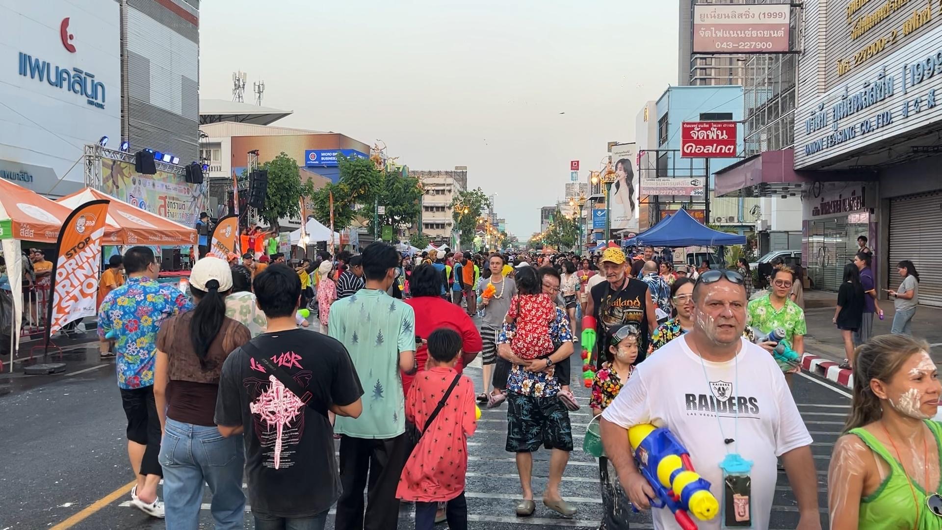 เมื่อเวลา 15.00 น. วันที่ 14 เม.ย. 2569 ผู้สื่อข่าวรายงานบรรยากาศการเล่นน้ำสงกรานต์วันที่ 2 บริเวณถนนข้าวเหนียว อำเภอเมือง จังหวัดขอนแก่น ยังคงคึกคักต่อเนื่องจากวันแรก โดยมีนักท่องเที่ยวทั้งชาวไทยและชาวต่างชาติเดินทางมาร่วมเล่นน้ำและกิจกรรมต่างๆ อย่างต่อเนื่อง