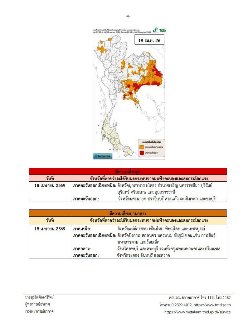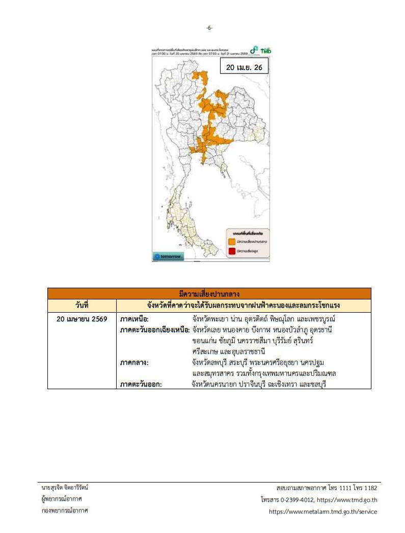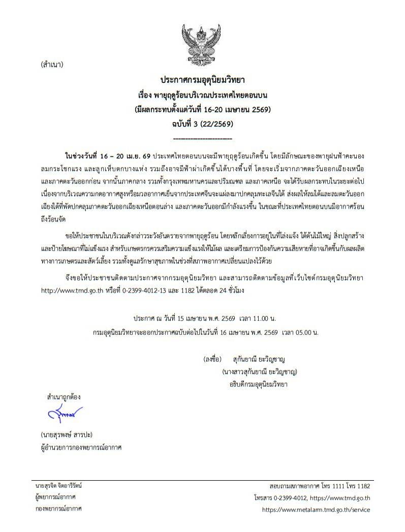 ประกาศฉบับนี้ออก ณ วันที่ 15 เมษายน พ.ศ. 2569 เวลา 11.00 น. โดยกรมอุตุนิยมวิทยาจะออกประกาศฉบับต่อไปใน วันที่ 16 เมษายน พ.ศ. 2569 เวลา 05.00 น. ลงชื่อ นางสาวสุกันยาณี ยะวิญชาญ อธิบดีกรมอุตุนิยมวิทยา รับรองสำเนาถูกต้องโดย นายสุรพงษ์ สารปะ ผู้อำนวยการกองพยากรณ์อากาศ และจัดทำพยากรณ์อากาศโดย นายสุรจิต จิตอารีรัตน์ ผู้พยากรณ์อากาศ กองพยากรณ์อากาศ