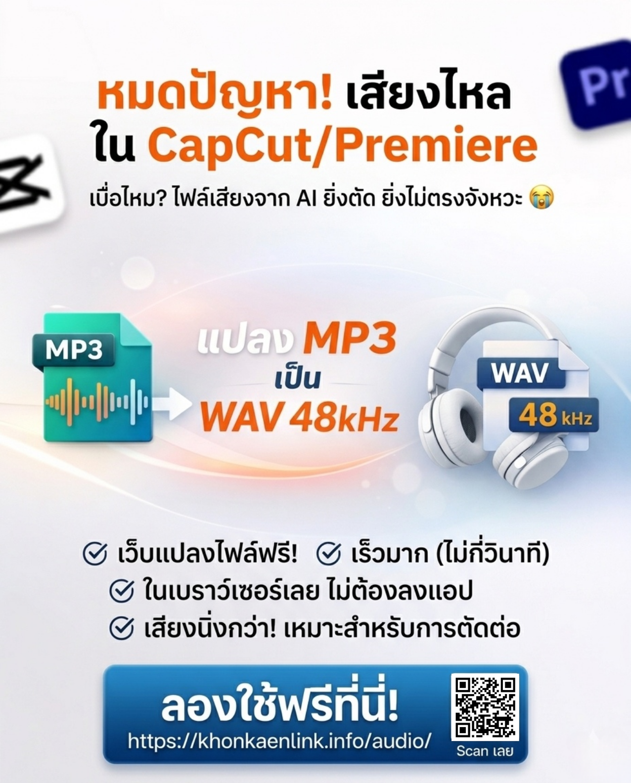 หมายเหตุ: การแปลง MP3 → WAV ไม่ได้ทำให้ “คุณภาพเสียงดีขึ้น” ในเชิงรายละเอียดที่หายไปแล้ว แต่ช่วยเรื่องความเข้ากันกับงานตัดต่อและความนิ่งของเวลาในการใช้งานจริง